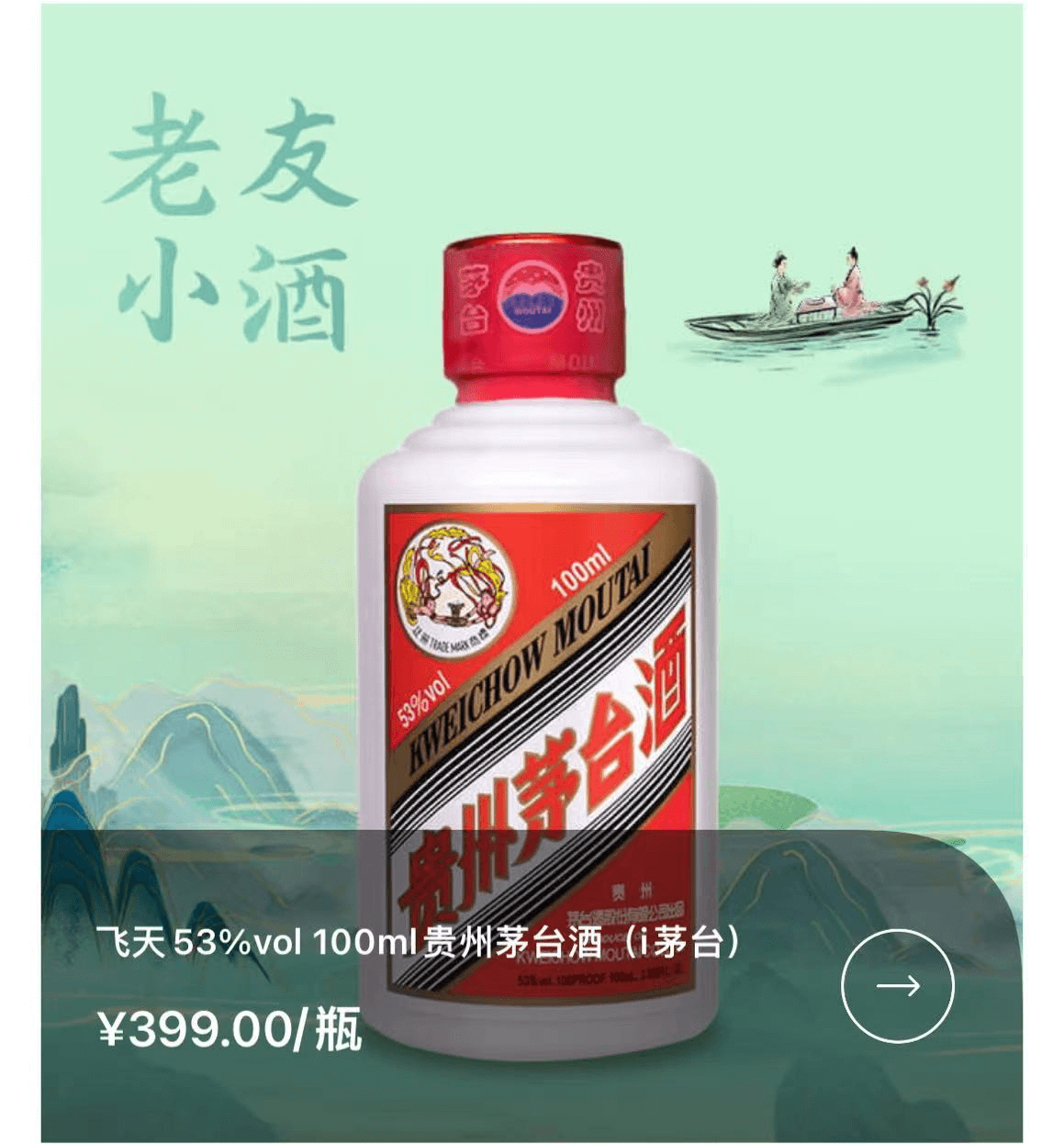 说的正是i茅台APP上可云购的飞天53%vol 100ml贵州茅台酒(i茅台),尽管标价399元/瓶,但附近的门店均售罄,说明市场接受度高,热度丝毫不弱于500ml飞天茅台,这暗示消费者愿意为茅台往后的提价买单。
