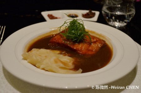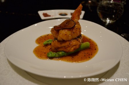 主菜是松露汁斯宾塞湾虾扒和翡翠豆腐。跟上一道菜当中一样,这大虾都是亮点。肉质滑嫩肥厚,其中的松露倒是可以和晚宴当中的第二款Lieu dit Malakoff2010 相互搭配。这款100%的Shiraz开瓶就是扑鼻的成熟果香和少许果酱的味道,酒体丰满,在口中十分开放。酸度清爽,单宁柔和有结构感。收尾带着少许烟熏味造成的苦感。和松露的搭配倒是相辅相承,松露浓郁的气味和同样浓郁的葡萄酒相互碰撞,交织出更复杂的回味。