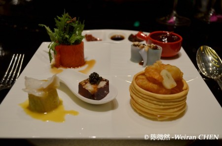 前菜分别是左下香辣螺片芥末墩,普洱茶挪威鳕鱼冻鲟龙鱼子酱,炸斯宾塞湾虾仁,左上脆菌西瓜沙拉,麻将凉皮菠菜卷,山楂小排。这菜一上来就让人看花了眼,看来看去也不知道应该从哪里入口。菜虽然精致可口,但是和晚宴上的第一款Domaine TerlatoChapoutier,Shiraz Viognier 2010很难搭配。这款酒大家都认为如果纯盲品,很难辨识出这是澳洲的葡萄酒。香气以胡椒,黑李子的味道为主,还带着少许花香。总体来说简单易饮,相对顺口。和山楂小排的搭配很有意思,酸甜之中带着胡椒味的点缀,虽然不常见,但是挺耐人寻味。