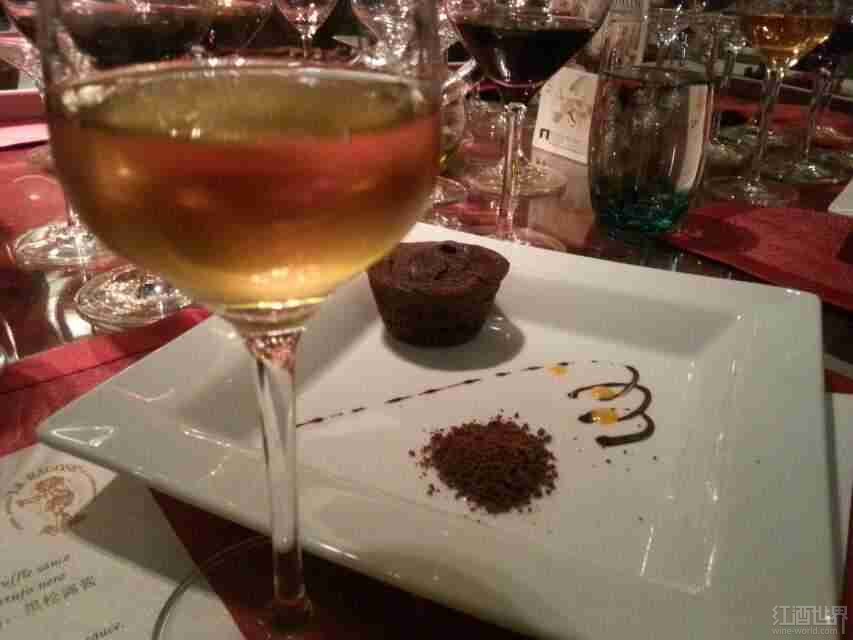 甜品时刻是一款精致的巧克力蛋糕,意舍慷慨地呈上了两款甜酒,一款为La Cappuccina Arzimo,是一款金黄色的 雷乔托(Recioto) 甜白;另一款是La Cappuccina Carmenos,是一款帕赛托(Passito)甜红。甜白充满蜂蜜、果脯味,结构复杂,口感圆润优雅,余味悠长;甜红则充满黑樱桃和巧克力的馥郁气息,结构优雅平衡,余味中还伴有一丝香料气息。小编认为,不管是甜红还是甜白都非常适合搭配该道巧克力甜点,不过,要说最爱的话,小编还是更偏好甜白。