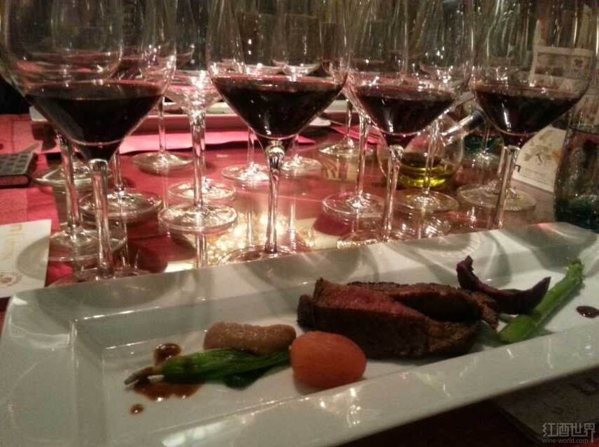 第三款酒和第四款酒都来自Le Ragose酒庄,而且都是阿玛罗尼干红葡萄酒(Amarone Della Valpolicella),两者也是此次酒会上最受人推崇的两款酒。这两款酒来自同一个酒庄,而且采用相同葡萄品种酿造,只是由于酿造方法的不同,造就其不同的风貌和口感。小编自认为对葡萄酒的认识尚未达到如此高的水平,因此只能略为体会这传说中的阿玛罗尼干红的魅力。不过基于同一桌的意大利籍贯酒商对其赞不绝口,而且还向我们这些葡萄酒学习者讲述两者之间的区别,我们才略有认识。第三款酒适合搭配第一道主食烤春鸡配凤尾鱼甜椒酱,阿玛罗尼的甜美口感非常适合鸡肉的翠嫩,甜椒酱的甜蜜与之交相辉映。而第四款酒阿玛罗尼采用古法酿造,因此风味更加浓郁,搭配第二道主菜香煎牛柳配红酒汁再合适不过,同桌的意籍酒商对这种搭配赞不绝口,一再地示意服务生倒酒