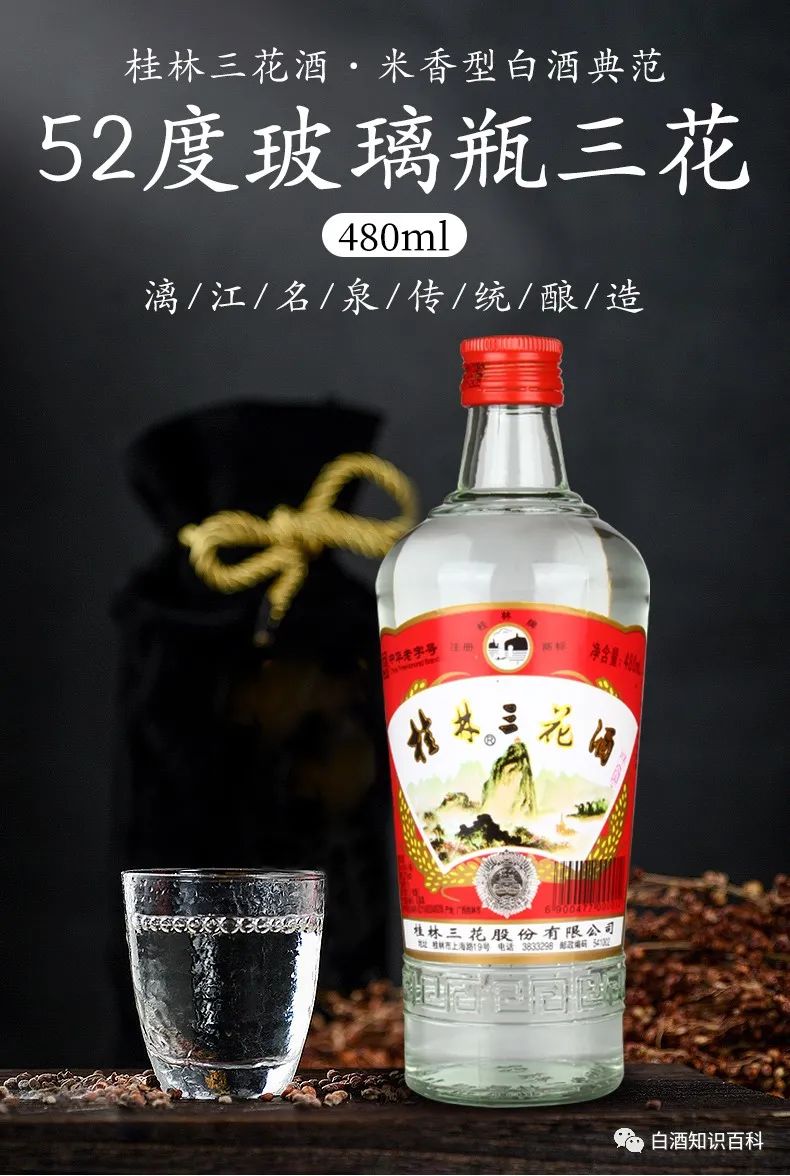 桂林三花酒是桂林三宝之一,也是中国米香型白酒的代表,被誉为米酒之王。因米香型属于小曲白酒酿造成本低,出酒快,所以价格不到30,就能买到纯粮酒。三花酒无色透明,蜜香清雅,入口柔绵,落口爽洌,回甜,饮后留香,适合刚接触白酒的朋友。