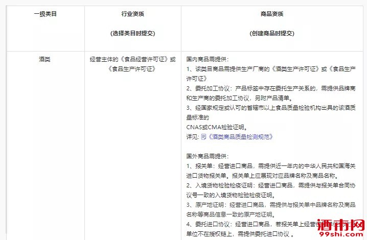 其他品牌,旗舰店需按照平台招商入驻规则要求提供品牌资质;专卖店需提供以商标注册人为源头的二级及以内品牌授权;专营店商家经营国内品牌需提供以商标注册人或其关联主体为源头的二级及以内品牌授权或经销授权。黄酒/米酒、露酒/果酒的旗舰店要求与上述内容相同,专卖店、专营店要求商家获得经营国内品牌需提供以商标注册人为源头的二级及以内品牌授权,经营国外品牌提供以商标注册人为源头的三级及以内品牌授权。行业资质和商品资质可见下图: