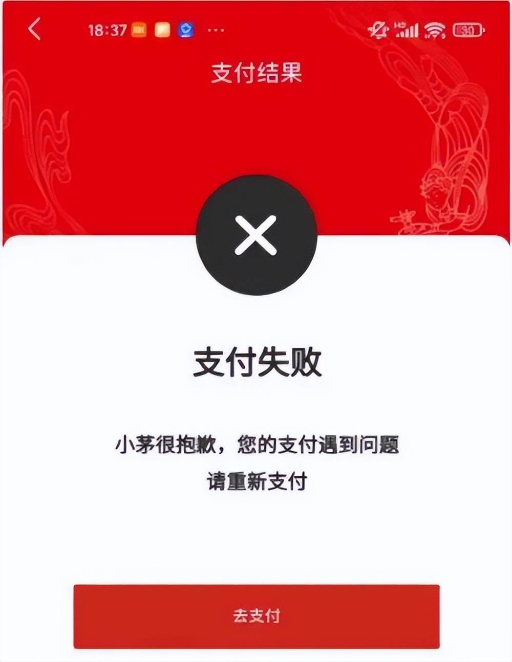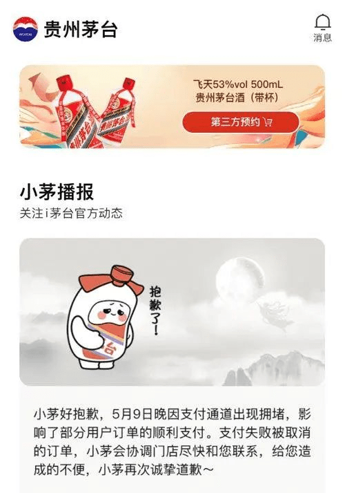 不管是真茅粉还是为了转手赚点小钱的“黄牛”,对于申购成功的那种喜悦以及激动,我是很能体会,但最近i茅台却发生了申购成功却无法付款的荒谬之事。就在这个月的9号下午六点,不少i茅台用户在收到申购成功的通知短信后,前往线上支付时被提示网络异常无法支付,并且拨打客户电话也联系不上人工服务,由于平台限制付款时间在30分钟之内,最后因为支付超时而自动取消了订单。
