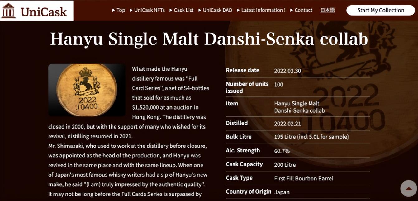 现在,它可以成为你家里酒柜上,可以喝的那瓶单一麦芽,或者波本威士忌。这可以看作NFT从先前的绑定虚拟物品到现在开始锚定实物的例子;NFT首次进入威士忌市场时,人们还在谈论唯一性数字证书带来的防伪特性。那现如今,NFT与威士忌的融合,则变得更加全面,更加市场化。