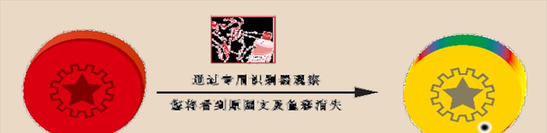 肉眼观察帽套顶部,帽顶外观为哑光红色圆形,圆中央有哑光红色烫金图案。手持防伪识别器靠近眼睛,视线通过防伪识别器按下开关,观察帽套顶盖。可以看出,帽子的顶部是亮黄色的,上面有黑色的浮点,可以随着帽套的旋转在亮黄色的背景范围内漂移。