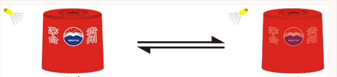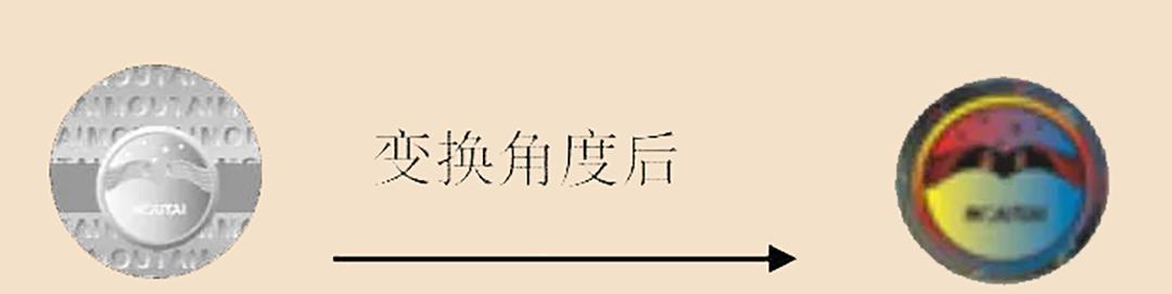 手持酒瓶正面观察帽身,可见茅台logo图案两侧出现金色“茅台”“贵州”字样 。前后倾斜晃动,背光倾斜帽身平视观察,可见左右两侧金色“茅台”“贵州”变成银色“贵州”“茅台”。