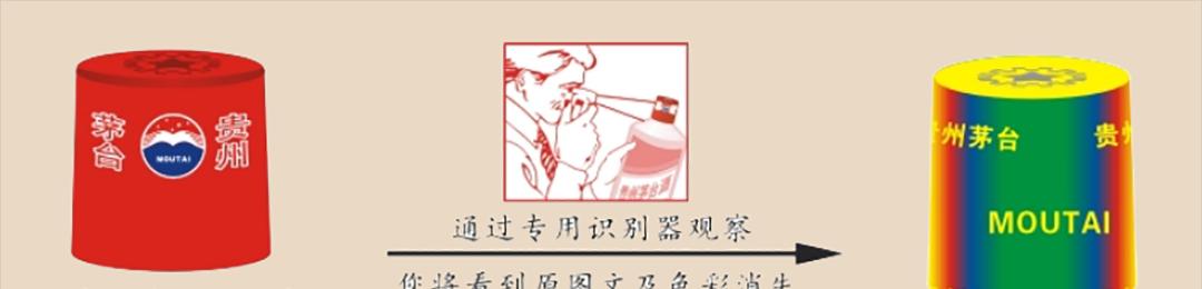 手持防伪识别器靠近眼睛,通过防伪识别器按下开关,观察帽套侧面。帽套表面的图片和文字消失了,呈现出彩虹背景和黄色的“贵州茅台酒”和“贵州茅台酒”MOUTAI”文字。