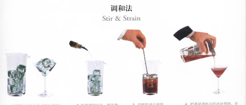 用大高脚杯混合,加入半杯冰,然后把划出的水倒出,尽可能的没有剩余,按配方依次往这个大高脚杯中倒入各种配料 用吧匙搅拌,把它们混合在一起,然后用滤冰壶把冰滤掉,制好的鸡尾酒,倒入高脚酒杯中,做好的鸡尾酒略作装饰就可销售了,如果鸡尾酒需要加冰,就应该使用新鲜的冰,而不用在高脚杯中混合过的冰。
