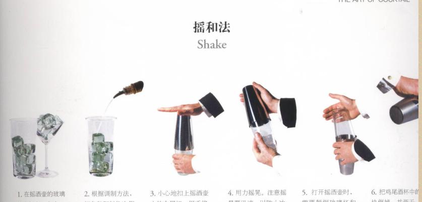 在摇酒壶的下部装入3/4的冰块,在冰的空隙的水要小心的倒出来,把配料倒入摇酒壶中,并将摇酒壶紧密的盖好,摇酒壶摇晃10秒钟左右,绝对的完美是不可能做到的折中方案就可以了,摇晃时间越长,混合越均匀,冷却越好,但是冰融化的也就越多,摇晃时间越少,均匀度和冷却的效果就越不理想,但是冰融化所产生的水就少,对酒的心事就越少,摇动摇酒壶时要会倾听发出的声音,由于冰的融化声音会发生变化,通过“摇酒壶的音乐”我们能知道停止搅拌,进行过滤和装备的最佳时期,为了避免过多的损失,最好不从酒类饮料开始混合,最先倒入摇酒壶的是果汁,然后是酒类饮料,最后依次倒入各辅料。