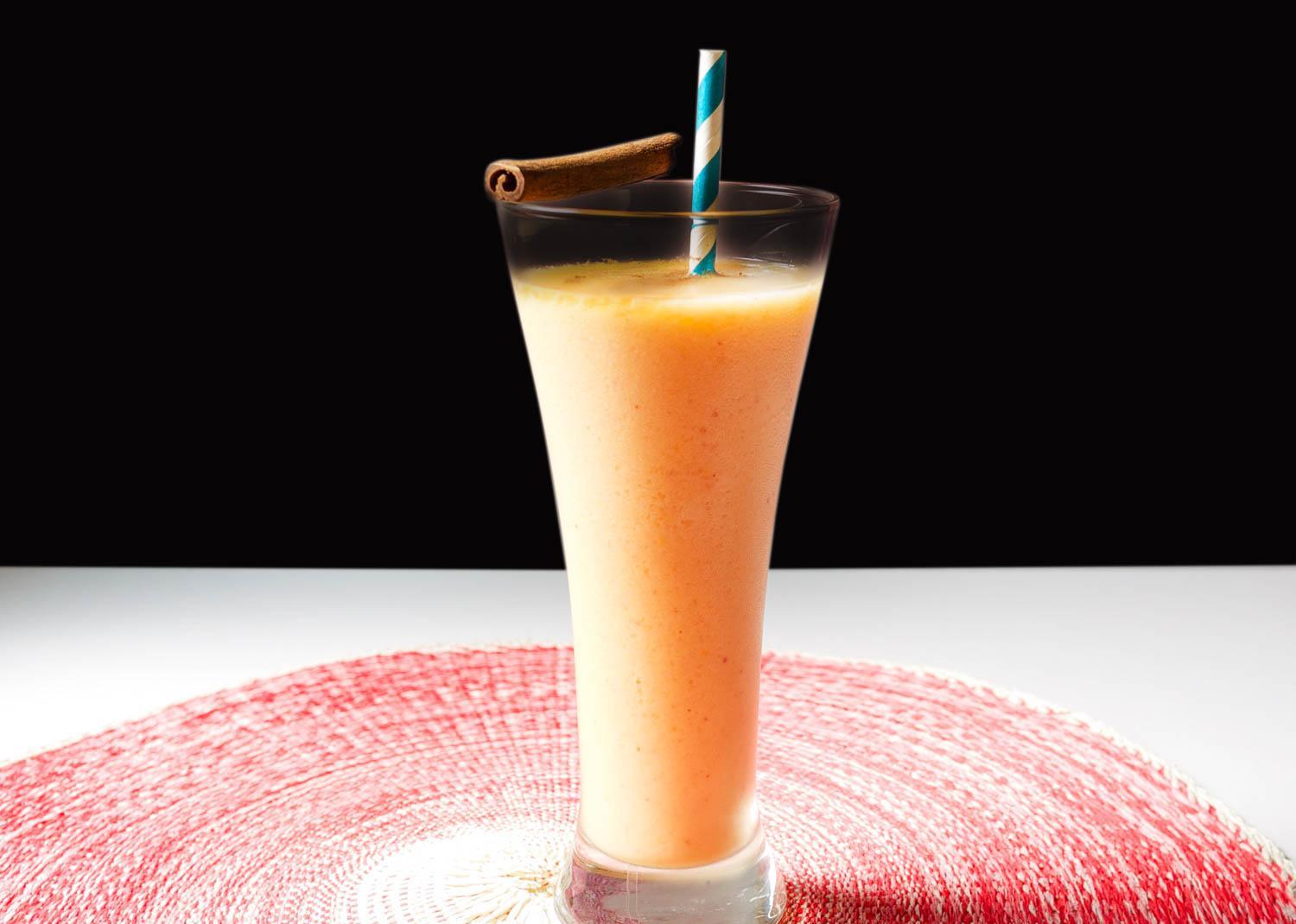 在搅拌器中放几块冰,添加削好的水果和其他材料,搅拌30秒钟左右,把鸡尾酒倒入高脚杯中稍加装饰就可出售了。