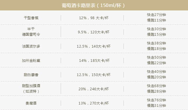 葡萄酒本身确实是有热量的,而且酒精度和甜度越高、热量越高。下面是葡萄酒热量和卡路里消耗参考表: