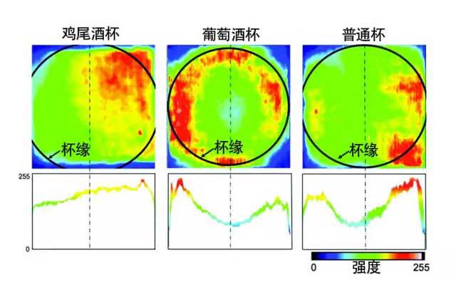 由于酒精属于易挥发性物质,因此当酒精从葡萄酒表面挥发后,香气也会随之散发开来,这样能利于饮酒者进行闻香。从图中可以看到,只有葡萄酒杯的杯口形成了环状的红色香气带,因此从闻香的角度来说,葡萄酒杯是最合适的。