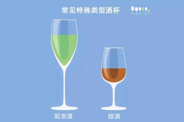 除了红白葡萄酒,常见的葡萄酒种类还有很多。因此对于一些特殊类型的葡萄酒如起泡酒和甜酒等,一般需要特殊的杯型(如图)。