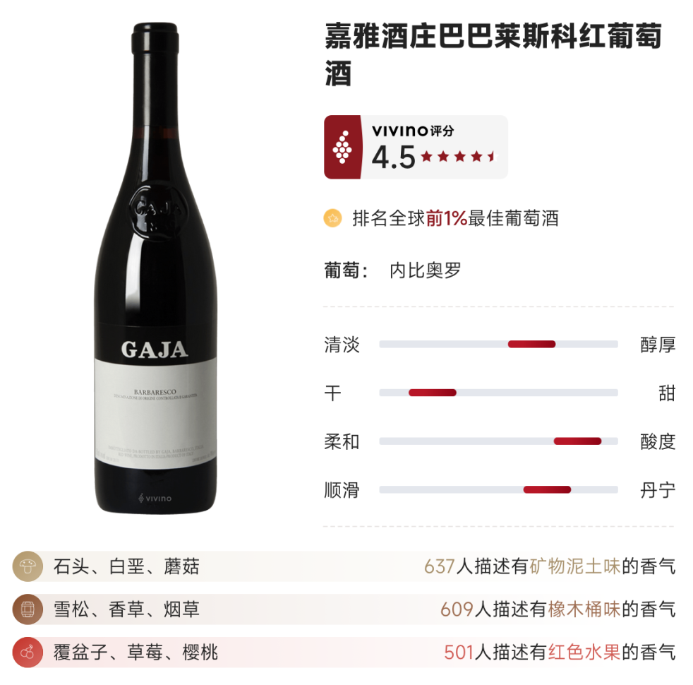 嘉雅葡萄酒充满非凡的精致感,散发着玫瑰、紫罗兰、芳香浆果和樟脑的浓郁香气。咸味口感,充满风味、活力和近乎空灵的优雅,带有红樱桃、覆盆子蜜饯和烘焙香料的味道,紧致、抛光的单宁。它以八角茴香为结尾,而充满活力的酸度则使其保持完美的平衡。