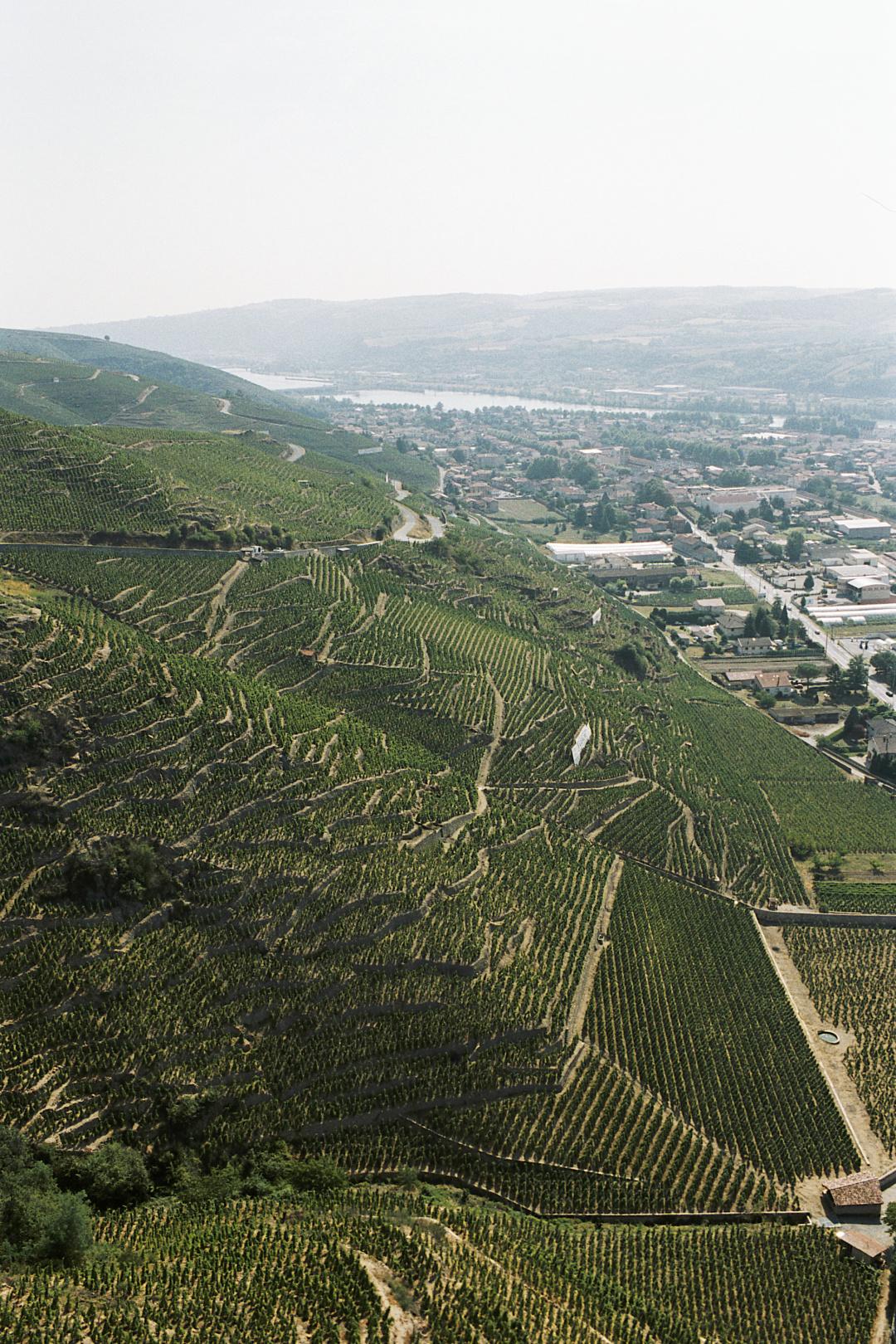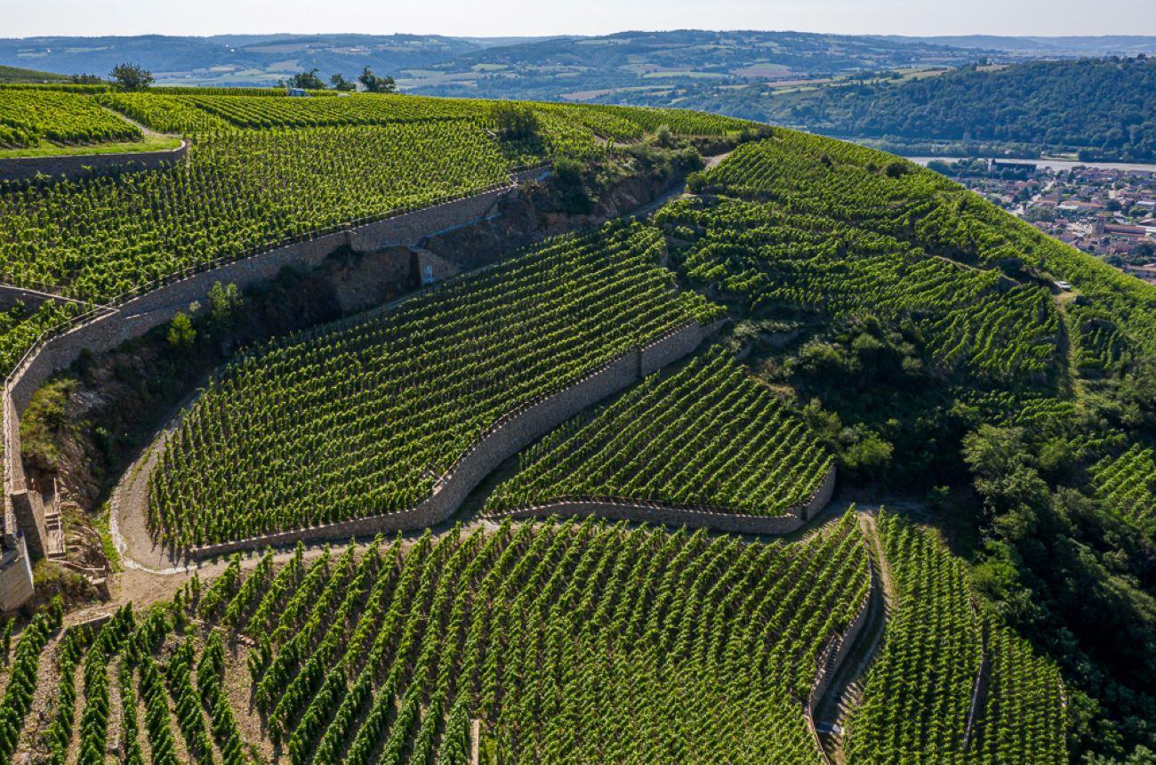 罗第丘(Côte-Rotie)位于罗讷河谷最北端,意为“灼热的山坡”,这里坡险峻陡峭,常年被火辣的骄阳炙烤。受地势影响,罗第丘的葡萄园大多修建于陡峭的斜坡上,部分园地的坡度甚至超过60°。为防止水土流失,葡萄农在葡萄园周围修建了石墙,形成了壮观的梯田景观。
