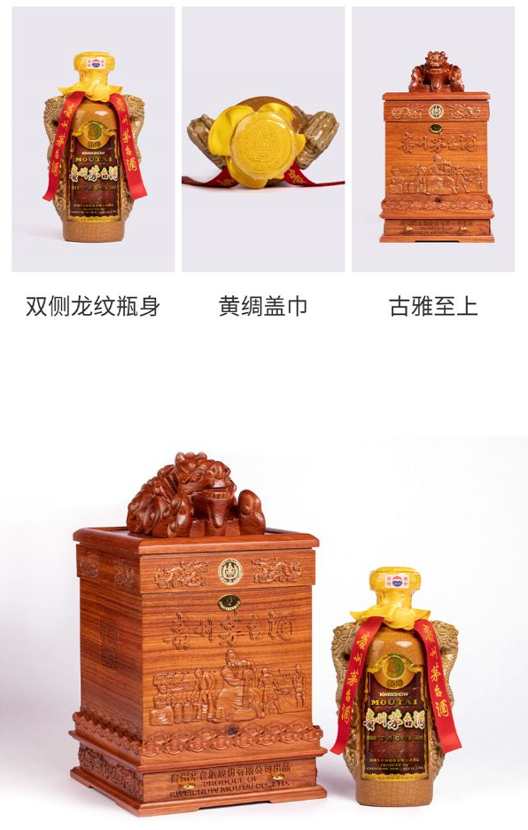 52%vol 500mL陈年贵州茅台酒(80)包装借鉴玉玺外观造型,酒盒采用花梨木材质,四周分别为“源远流长”“汉帝骑马图”“巴拿马万国博览会金奖”“宴请”雕刻图案,盒内配置镀金酒樽、24K金牌、收藏证书。酒瓶为紫砂裂纹陶瓶材质,两侧为气势磅礴的祥龙祥云雕刻造型,搭配黄色盖巾及宽红色丝带。包装风格高端、大气。