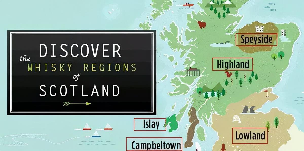 (1)苏格兰斯佩塞(Speyside):苏格兰最受欢迎的威士忌产区,这里出产的威士忌以极其复杂和丰富而知名,其口感温和,总是有一种雅致的烟熏味道。世界上品牌知名度高的几大威士忌:格兰利威(Glenlivet)、格兰菲迪(Glenfiddich)及格兰花格(Glenfarclas)均出自该产区。(2)苏格兰高地(The Highlands):高地是苏格兰地理面积最大的威士忌产区,其威士忌风格也多样。一般来说,高地产区的威士忌最为粗犷,带有辛辣和烟熏的味道,口感丰富。主要品牌为格兰杰(Glenmorangie)和达尔摩(Dalmore)等。(3)苏格兰低地(The Lowlands):低地产区出产的单一麦芽威士忌最平淡无奇,主要以平滑柔和的口感以及自然的麦芽味道而知名。著名品牌:格兰金奇(Glenkinchie)等。(4)苏格兰艾莱岛(Islay):艾莱岛是苏格兰第四大威士忌产区,尽管面积小,只有 240 平方英里左右,但出产的威士忌品质却独具特色。由于当地煤较多,在麦芽制作过程中都会用泥煤熏干,因此,艾莱岛威士忌常带有显著泥煤味道,还带有苔藓、烟熏、海草及盐的香味。知名品牌:阿贝(Ardbeg)和拉弗格(Laphroaig)等。(5)苏格兰坎贝尔镇(Campbeltown):坎贝尔镇虽然只有寥寥无几几家威士忌酒厂,但品质绝对不会让你失望。但名气上相比其他几个产区,已经弱势一些。知名品牌:云顶(Springbank)。虽然苏格兰是单一麦芽威士忌的代名词,但同样拥有清澈水源、优质大麦、泥炭和清爽适度气候的爱尔兰和日本也是制作单一麦芽威士忌的代表产区。这 2 个产区酿造的威士忌也各有千秋,香气和口感均较好,品质上乘。爱尔兰目前只有少数几家威士忌酒厂,知名品牌为:尊美醇(Jameson);日本威士忌知名品牌有:山崎和白州等。
