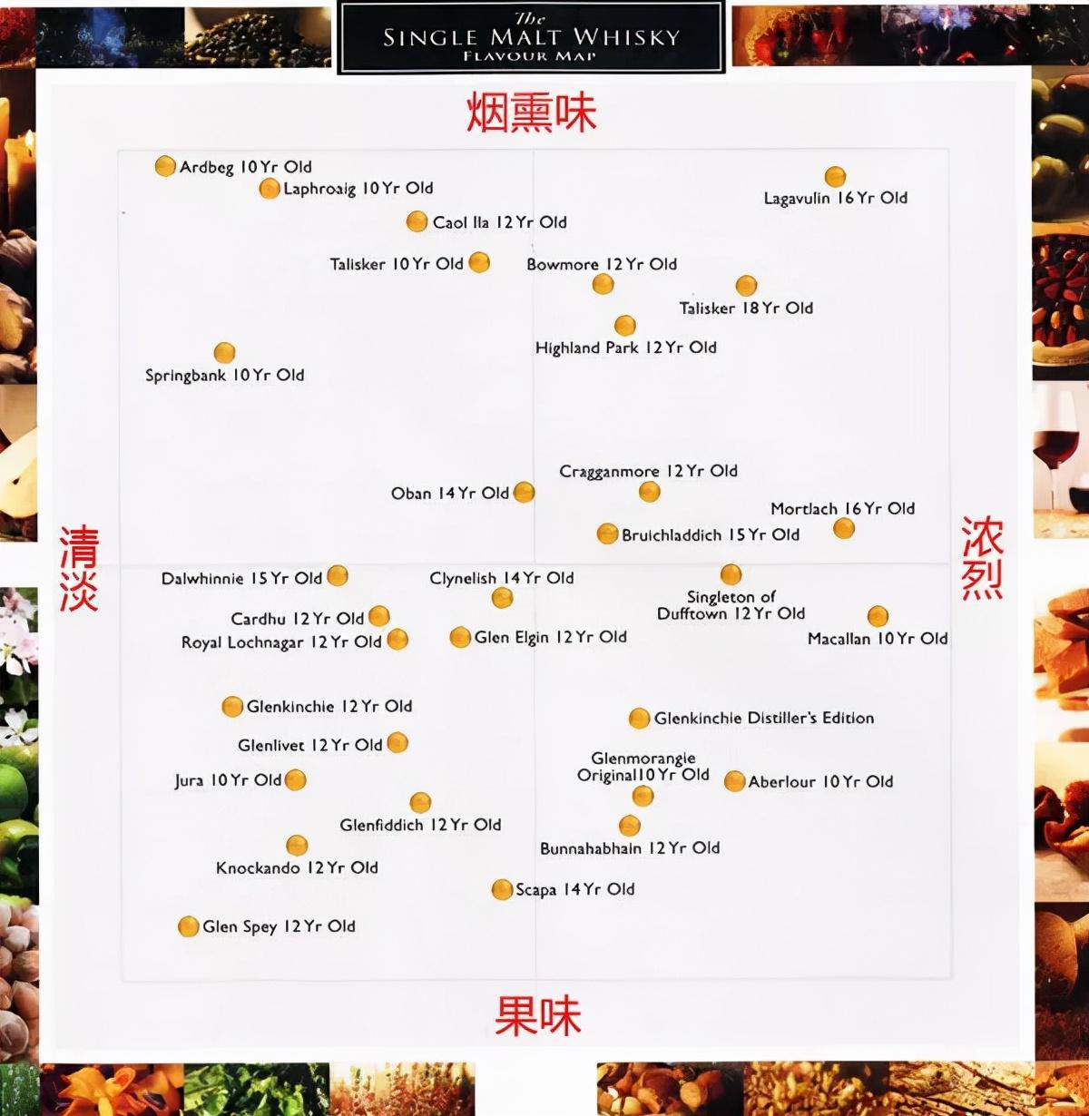 生产威士忌的厂家少则有几百家,其生产的单一麦芽威士忌更是数不胜数,那如何挑选出自己喜欢的单一麦芽威士忌呢?著名威士忌酒评家迈克 杰克逊的“威士忌天书”《纯麦威士忌全书》(Malt Whisky Companion)一文中,将单一麦芽威士忌按照(烟熏味、果味、口感淡和浓烈)4 方面进行定位。因此,各位酒友可以通过自己的口感爱好,寻找最适合自己的单一麦芽威士忌。
