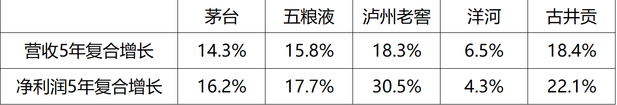 从净利润复合增长率来看,泸州老窖古井贡五粮液茅台洋河