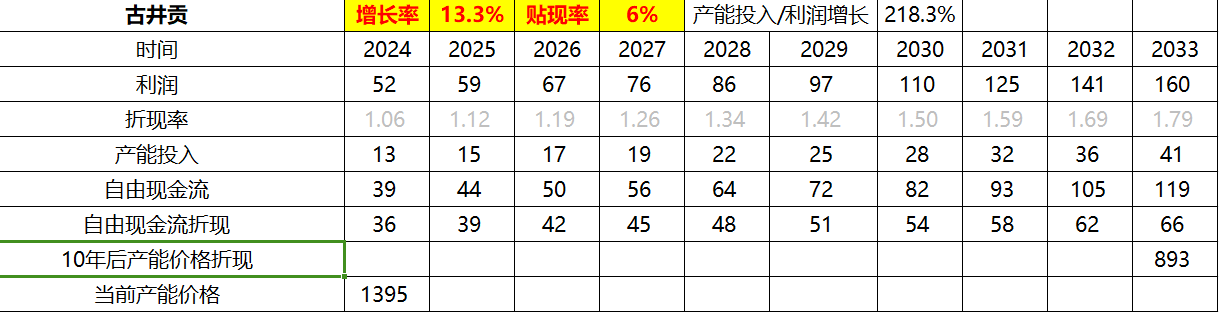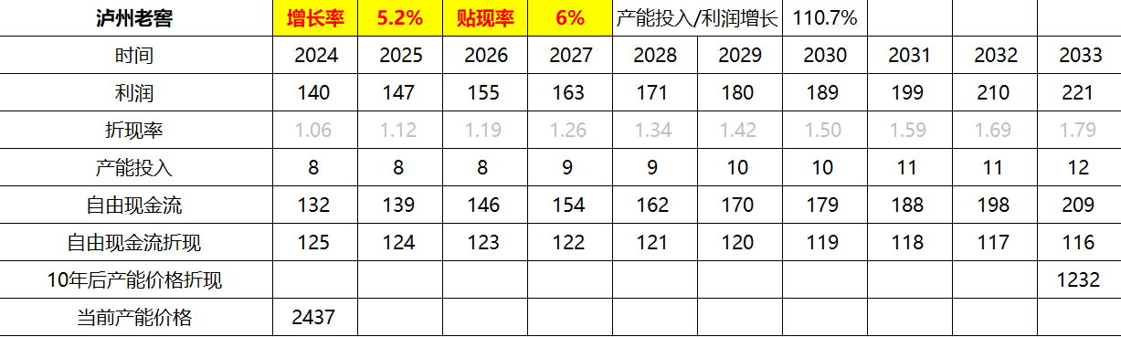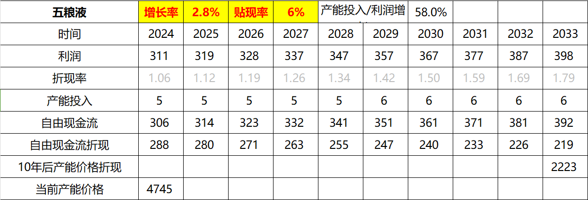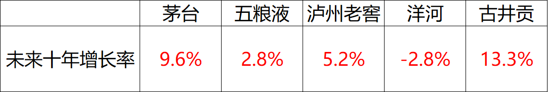 我们假设,十年之后,高端白酒行业已经到达行业天花板,产能市盈率全部降到10倍,用现金流折现方式并以6%贴现率当前市值为前提,计算他们的增长率可得