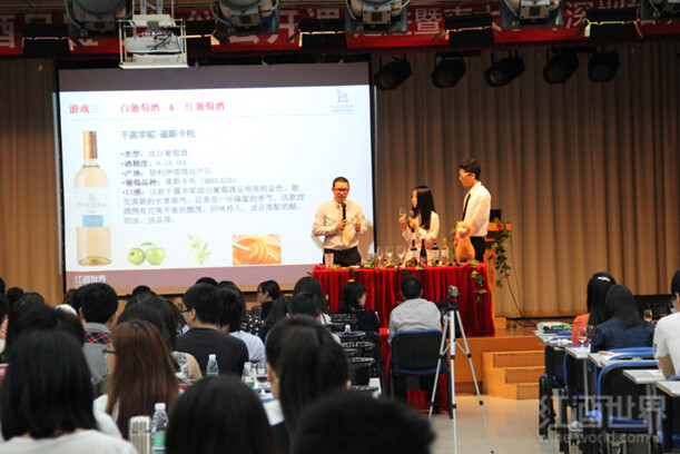 本次讲座的讲师是红酒世界网高级讲师Jack,他以一种幽默风趣的方式向同学们传递了葡萄酒的相关知识。Jack老师从红酒的种类讲到执杯手势,从酿酒的葡萄品种讲到不同年份的红酒,从葡萄酒起源讲到当今的发展趋势,中间还穿插了自己的独到见解,以使红酒知识简化,同学们都听得十分入迷。讲座期间,红酒世界网还特地准备了三次游戏,将同学们彻底带入到了红酒的世界。