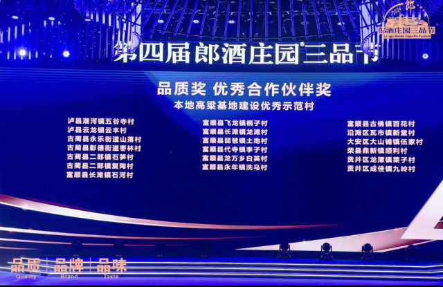 在本届郎酒庄园三品节中,首批颁发的奖项是质量奖·优秀合作伙伴奖。获奖者为古林县二郎镇复陶村、石笋村等40个高粱基地建设优秀示范村。