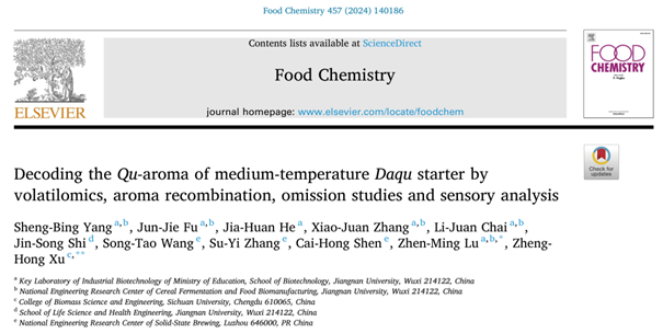 近日,四川大学轻工科学与工程学院许正宏教授、江南大学生物工程学院陆震鸣教授,联合泸州老窖国家固态酿造工程技术研究中心沈才洪主任团队,在国际食品研究领域TOP期刊《Food Chemistry》(Q1,IF:8.5)上发表了题为“Decoding the Qu-aroma of medium-temperature Daqu starter by volatilomics, aroma recombination, omission studies and sensory analysis(基于挥发组学、香气重组与缺失和感官分析解码中温大曲的曲香特征)”的研究论文。江南大学生物工程学院博士研究生杨生兵为第一作者,许正宏教授、陆震鸣教授为论文通讯作者。