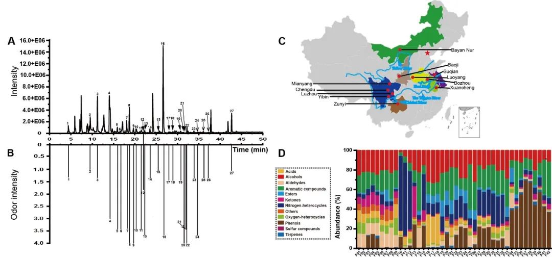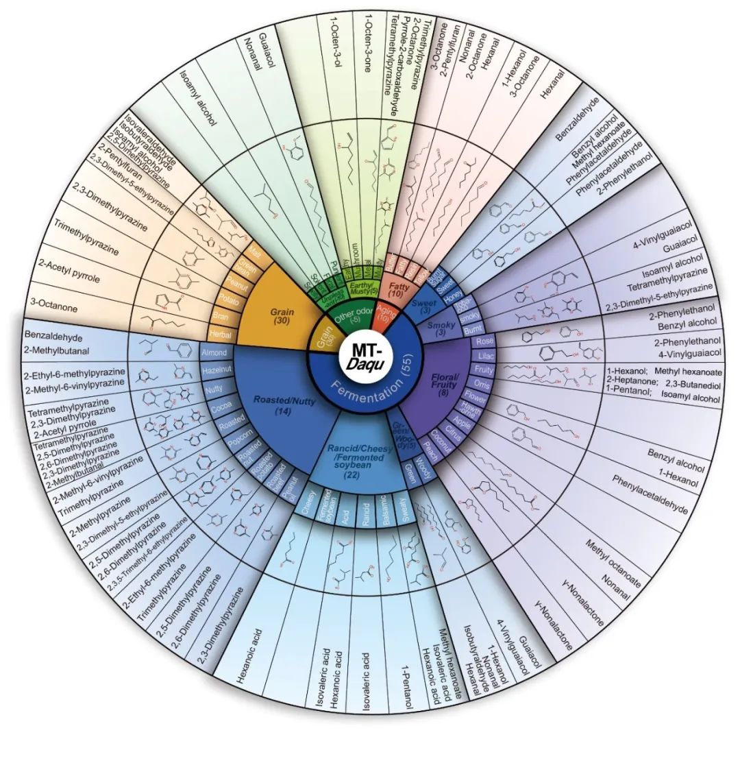 研究团队采集了全国不同浓香型白酒产区的42个中温大曲样品,设计了“自上而下”和“自下而上”相结合的研究策略,采用挥发组学和感官评价等方法,确定了52种曲香香韵描述词,鉴定了37种曲香活性化合物,构建了包含曲香风味描述和曲香活性化合物信息的中温大曲曲香香气轮。在此基础上,重构了中温大曲曲香并鉴定了其中26种关键曲香活性化合物。相关研究成果为大曲品质的科学评估和质量标准的建立奠定了研究基础,为白酒行业“新质生产力”的发展提供了重要保障。