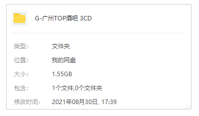 本资源为《广州TOP酒吧》3张CD顶级HI-FI黑胶天碟合集[WAV/1.55GB]百度云网盘下载,格式为WAV,做压缩包处理,需要下载后解压播放,资源大小1.55GB。