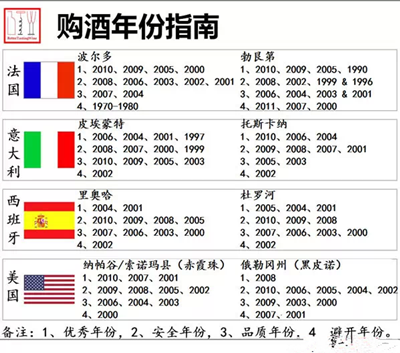 要记住众多产地的年份好坏稍微有些难度,但是21世纪以来主要国家和地区的好年份不妨记一下:法国波尔多2000,2003,2005;法国勃艮第2002,2003,2005;意大利托斯卡尼2001;西班牙里奥哈2001;美国加州2001,澳大利亚,2002;南美2001,2003。