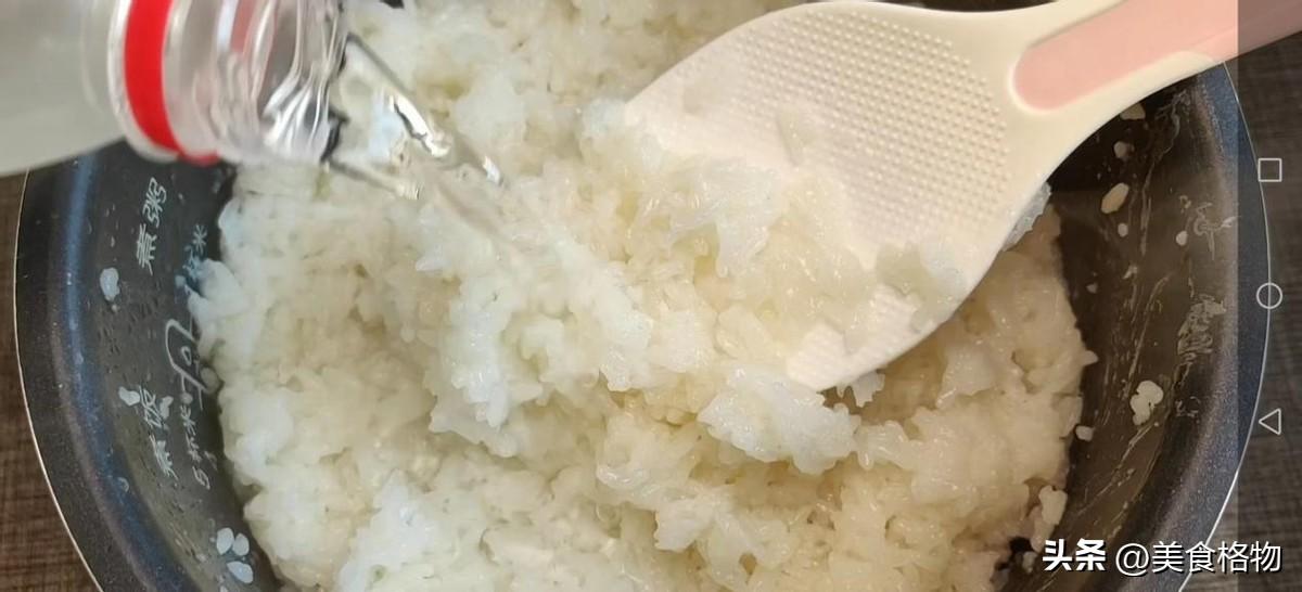 将泡好的糯米全部放进电饭锅中,记得把电饭锅刷干净,千万不要沾油。放入糯米之后,放入一些清水,将其蒸成糯米饭。这一步您可以直接选择用蒸锅放上屉布把这些米蒸熟,也可以像我们平时在家里面煮饭一样,这样给它煮熟,但是切记水量放的要少一些,最好可以让这些糯米保持一粒一粒的状态,盖好盖子之后直接按煮饭键将其煮熟。煮好之后可以看到这些糯米饭,不会过于软,而是可以保持一粒一粒的状态,到这样的程度就刚刚好。
