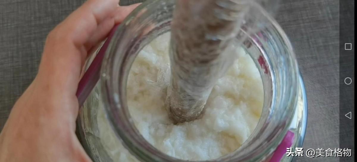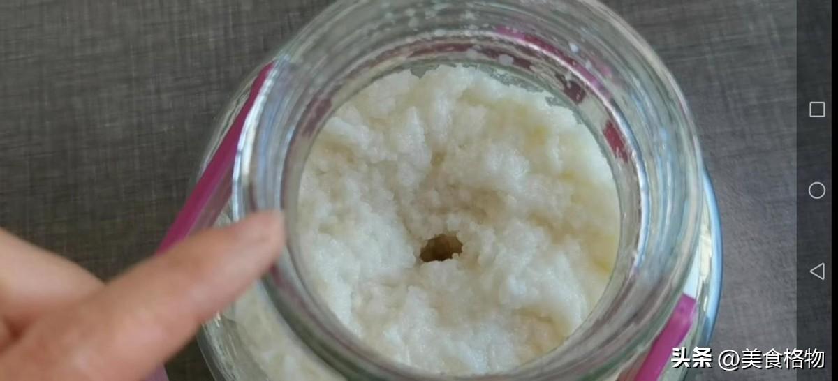 糯米全部放进去之后,用小勺子将其摊平,中间用擀面杖之类的压一个小酒窝,之后把盖子盖好,放到一个太阳光无法直射的地方,密封发酵即可。发酵酒其实时间不用很长,尤其是现在天气比较暖和,四到五天左右,中间就可以看出糯米酒。慢慢的酒越来越多,这些糯米也会浮在酒面上,发酵到这样的程度就可以拿出来喝了。