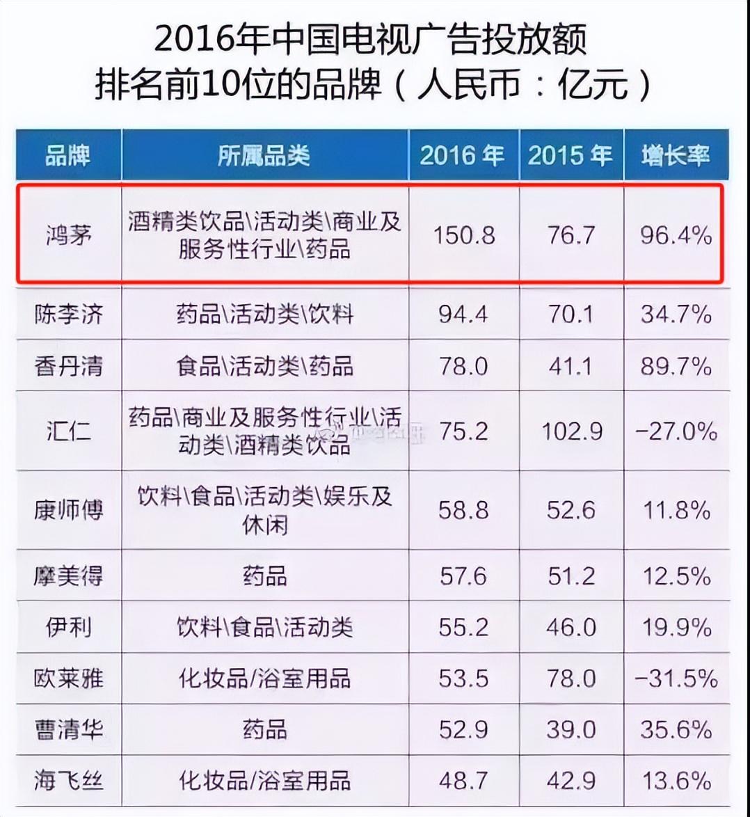 更让人印象深刻的是它的广告铺天盖地,几乎无孔不入。上过央视和地方电视台;出现在公交地铁;大商场和小卖部也被占据,光2016年它的电视广告投放额就有150亿。毫不夸张的说,在本世纪的头二十年里,鸿茅药酒就是妥妥的“广告之王”。