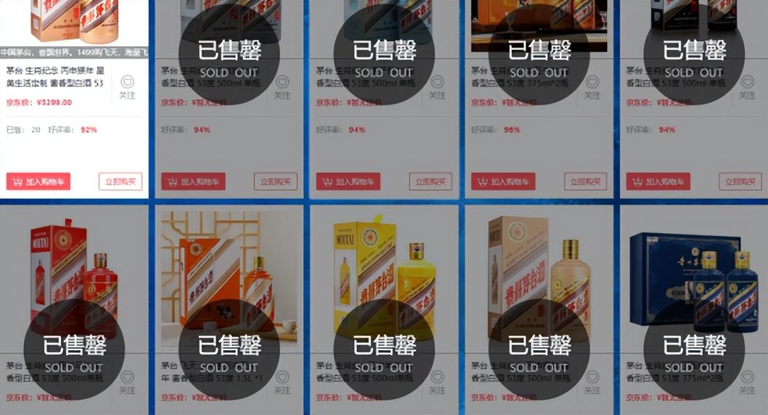平日里茅台的难抢是出了名的。有时候定好闹钟进入茅台官网准备下手,就只看见有个圈圈显示网络不好,等网络好了能点开了,早就没了。如果这样都还不够直观,我们打开某购物网站,满屏的售罄就知道大家抢茅台的心情了。