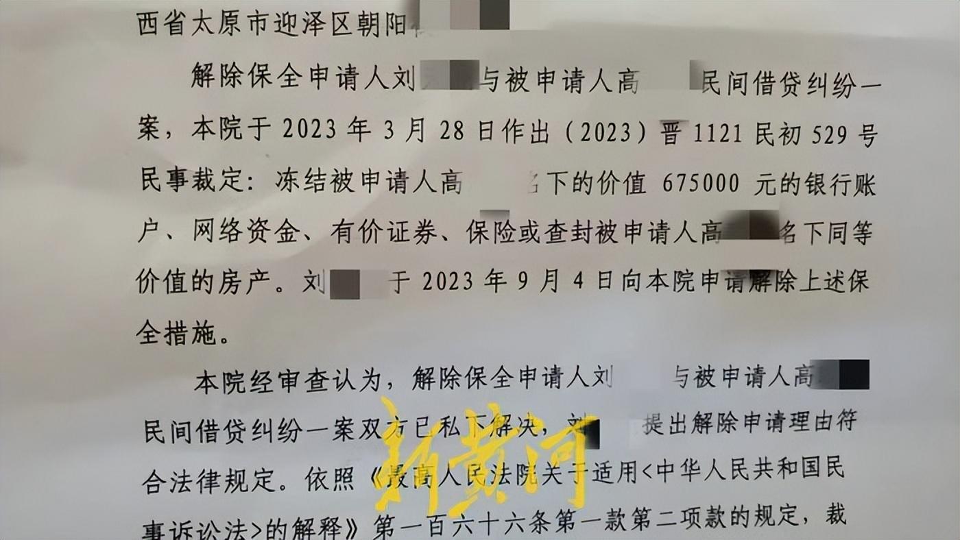 新黄河记者了解到,高某敏还牵扯到多起民事案件纠纷当中。根据一份法院判决书显示,因涉一起民间借贷纠纷案,文水县法院曾于2023年3月28日作出民事裁定:冻结被申请人高某敏名下的价值675000元的银行账户、网络资金、有价证券、保险或查封被申请人高某敏名下同等价值的房产。后该案申请人刘某于9月4日向法院申请解除上述保全措施。“刘某是高某敏的同学,在该投资项目中,高某敏曾多次安排我向刘某进行借款。”李晓芸说。