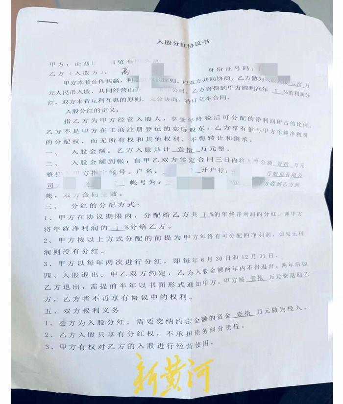 除此之外,李晓芸还向记者提供了一份高某敏与山西某公司于2019年8月31日签订的“入股分红协议书”,协议约定高某敏入股10万元,按该公司年终净利润的1%进行分红,协议期限两年。12月10日,新黄河记者多次致电该公司多部联系电话,皆未接通。高某敏本人亦未接听记者电话和回复记者短信发出的采访请求。
