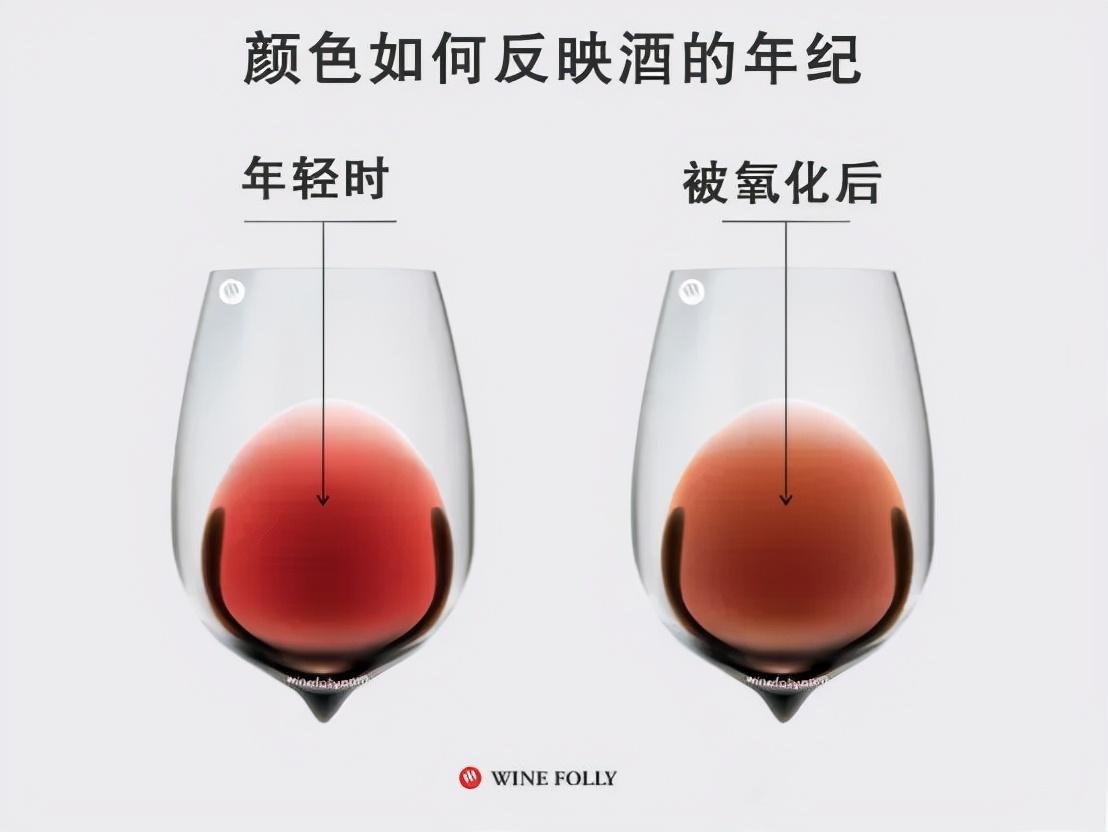 酒液颜色通过颜色,我们也可以初步判断酒的状态。不论是红葡萄酒还是白葡萄酒,随着年纪增长,由于氧化,颜色都会逐渐转棕色调,且红葡萄酒颜色会越来越淡,而白葡萄酒则颜色会越来越深。