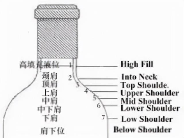 酒在刚出厂时,水位基本都在最高的那条线处(High Fill),我们把这条线叫做 1 ,随着时间的流逝,比如过了 3、40 年,水位会逐渐下降到第 3、4 条线处(Top Upper shoulder),再往下风险可能就会比较大了,说明在保存过程中有大量氧气进入,酒精挥发得较多,酒也过度氧化了。不过,要是一瓶酒放了一个世纪,那么下降到 4 以下也是可能的。