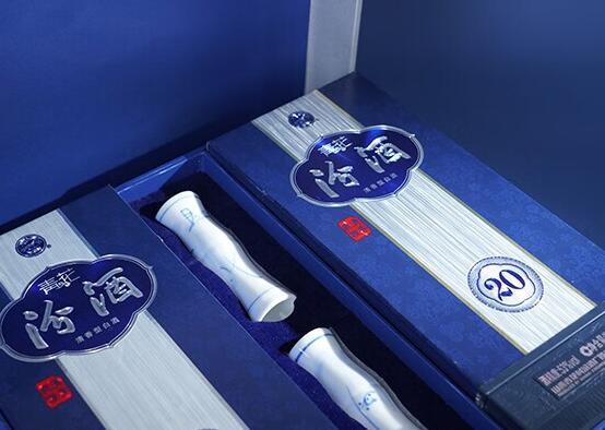 汾酒20年青花瓷的瓶身采用了中国传统的青花瓷风格,以汾字为主体,写满了各种字体的酒字,从汉字发展的角度阐释了汾酒的历史悠久。