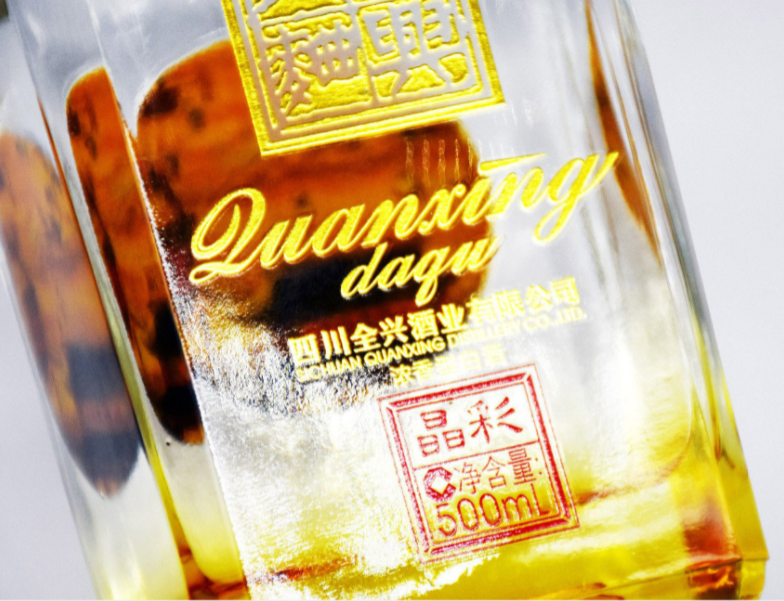 酒瓶:透明玻璃瓶身,瓶底是黄色琉璃,酒液在瓶中泛着金色,很是绚丽。