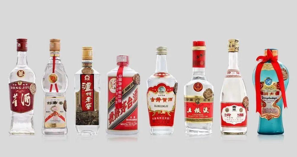 老八大名酒(1963年评选):茅台、五粮液、汾酒、泸州老窖、古井贡酒、董酒、西凤酒、全兴大曲