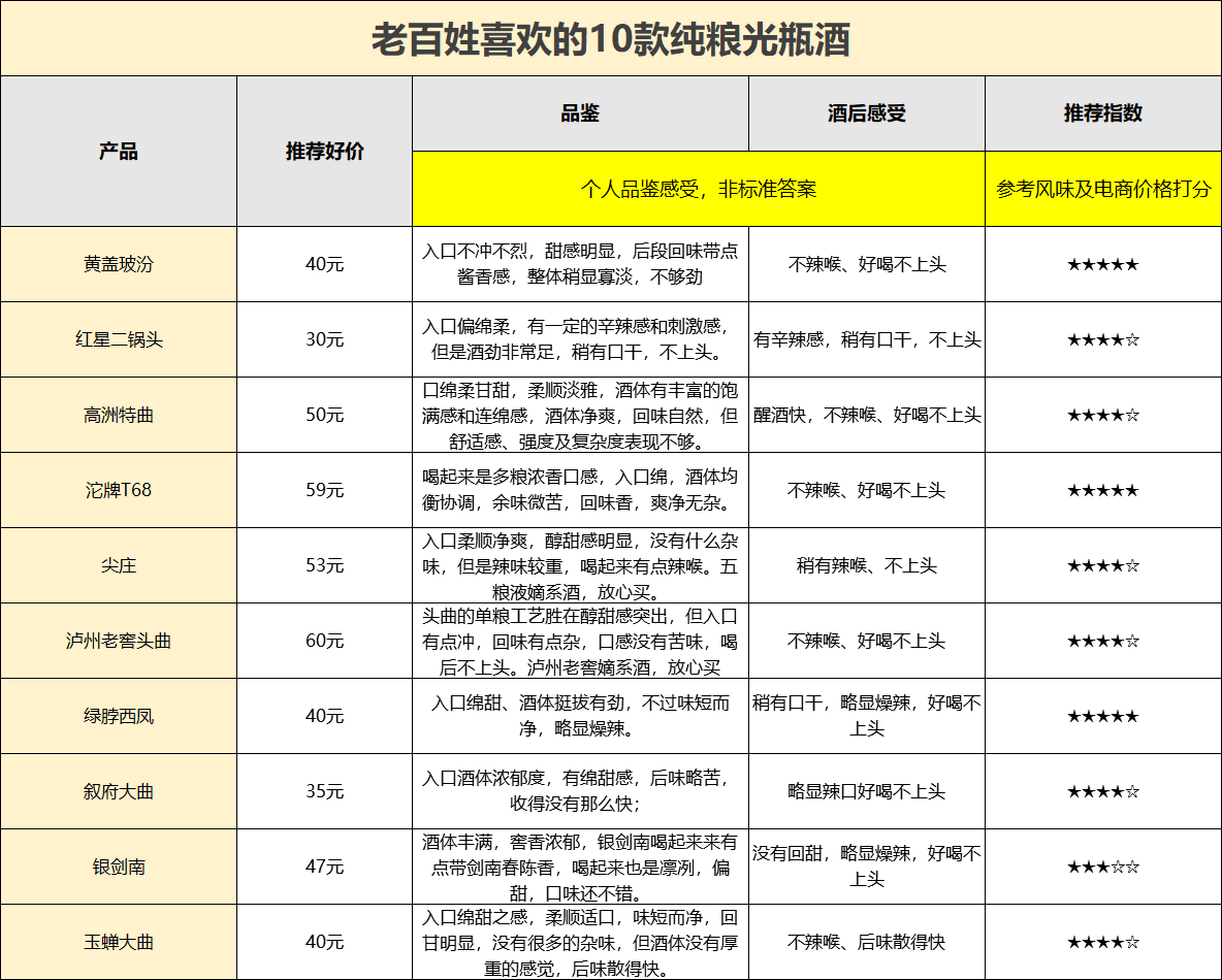早期的五粮液、泸州老酒、汾酒、西凤等名酒都是光瓶起家,现在的光瓶酒一方面是延续了这个传统,另外一方面确实能节约成本,提高了性价比,它省去了包装费,只有一个透明玻璃瓶和瓶身上的标签纸,来表明它的成分和一些重要参数。当下光瓶酒面向的是低端白酒市场,也可以看做是酒厂最后的遮羞布,如果这都要出问题,那贞操就会碎一地。今天结合历史、认可度、口感、口碑、性价比等多个方面,整理了10款2023年最受欢迎的光瓶酒,全部都是大厂嫡系酒,品质不错,性价比高,纯粮口粮酒!
