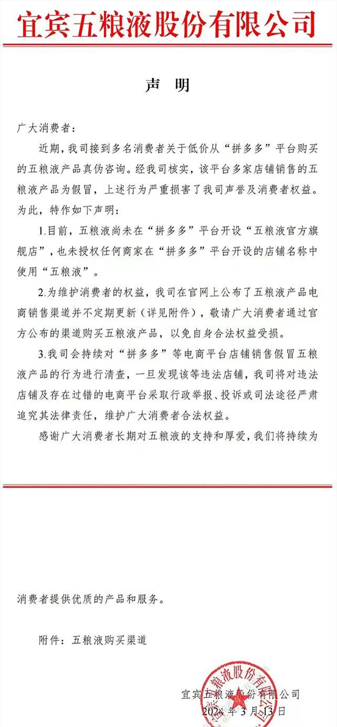 五粮液在声明中表示,目前,公司尚未在“拼多多”平台开设“五粮液官方旗舰店”,也未授权任何商家在“拼多多”平台开设的店铺名称中使用“五粮液”。