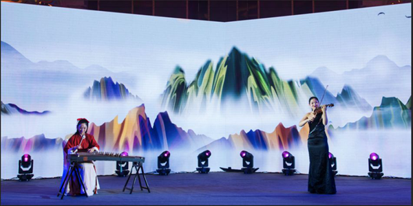 合奏《玄乐筝鸣》,创新以能够代表中国悠久文化的古老民族乐器古筝与起源可追溯到2000多年前的西方乐器小提琴合奏斗技,将现场氛围推向高潮,西秦东瑟两千年的文化交融争鸣,正是新中式生活美学所在。