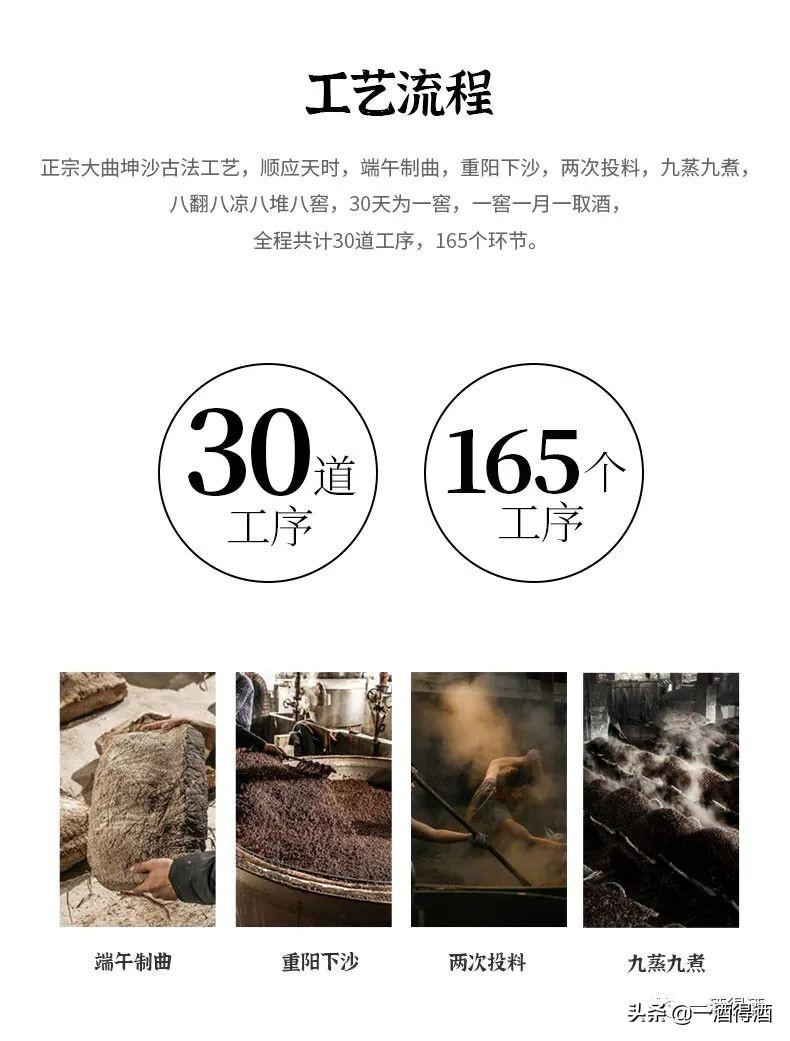 采用原料为本地糯性高粱(红缨子高粱,也称小红梁),优质的小麦以及赤水河畔优质的河水,也是百姓的生活用水。经过一年一个生产期。二次投料。九次蒸煮,八次发酵,七次取酒酿造而成,也是酱香型白酒的传统工艺。