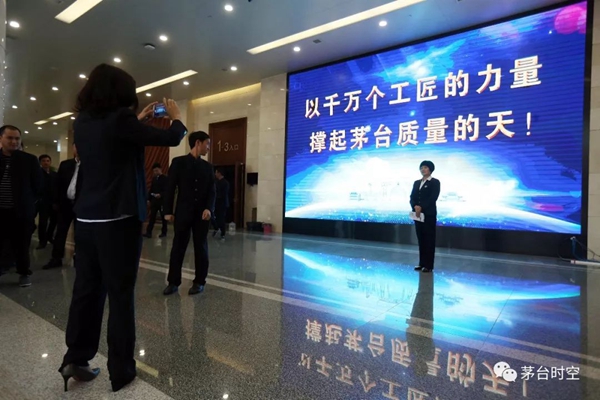 一个值得注意的细节是,会议当天一大早,茅台集团领导层就整齐列队,站在会议中心门口,向每一位步入会场的工匠、大师、一线工人致敬。此番列队欢迎释放出一个强烈的信号,即在大厅LED显示屏上滚动播放的口号“以千万个工匠的力量撑起茅台质量的天”。