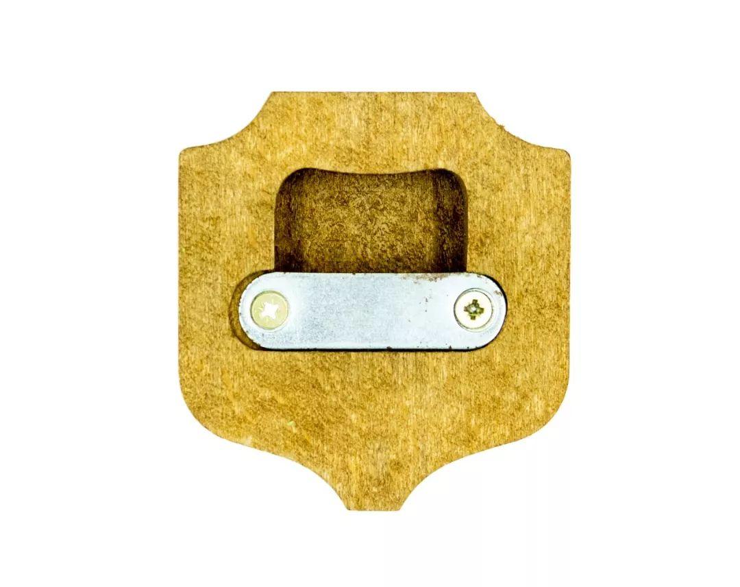开瓶器的开瓶机构在背面,挖空的木头上镶嵌了一块铁片。