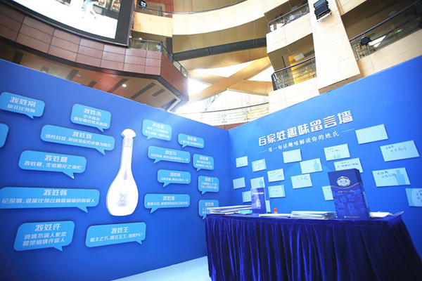 1月21日-1月22日,洋河在南京水游城搭建快闪店——百家姓趣味馆,正式发力天猫欢聚日,掀开“百家姓”主题的全面传播,从“姓氏+酒文化”延展趣味内容,花式互动环节福利多多,开馆第一天便迎来流量高峰。