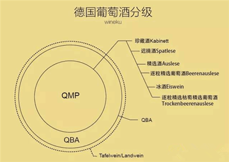 德国葡萄酒不是以酒庄或产区来划分等级,而是依据葡萄采摘时的成熟度来划分等级。这主要是因为德国所处纬度较高,因此气候较为寒冷,对葡萄的成熟度影响较大,而葡萄的成熟度又对葡萄酒的质量影响非常大,同时也是消费者购买葡萄酒时的一个重要参考指标。简单来说,目前德国葡萄酒共分为四个等级:日常餐酒(Tafelwein)、地区餐酒(Landwein)、优质餐酒(Qualitatswein bestimmter Anbaugebiete,简称QbA)和高级优质餐酒(Pradikatswein)。其中,Pradikatswein是由Qualitatswein mit Pradikat(简称QmP)于2007年更名而来。
